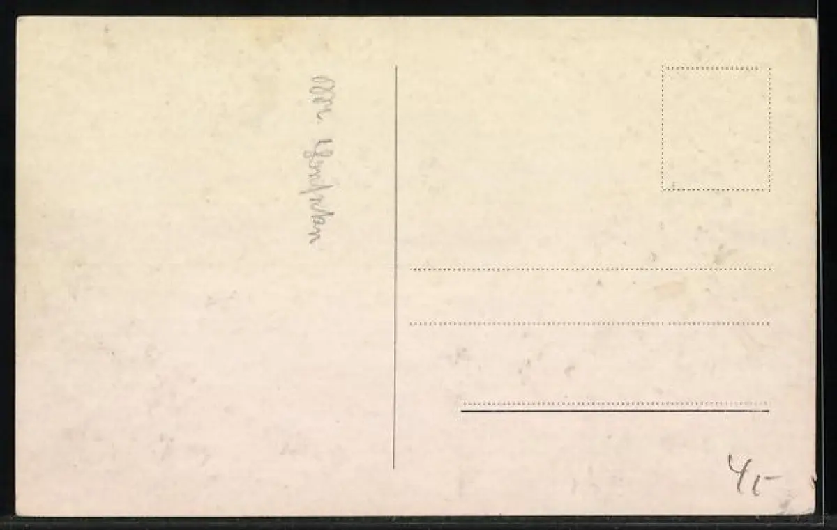 Personenbezogene Daten auf der Rückseite der Karte wurden durch blauen Textmarker unkenntlich gemacht. Die blauen Stellen sind auf die Vorderseite durchgeweicht und wirken sich negativ auf das Postkartenfoto aus