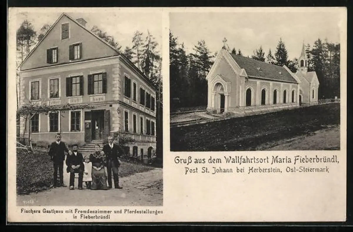 AK St. Johann bei Herberstein, Gruss aus Maria Fieberbründl, Fischer`s Gasthaus und Wallfahrtskirche