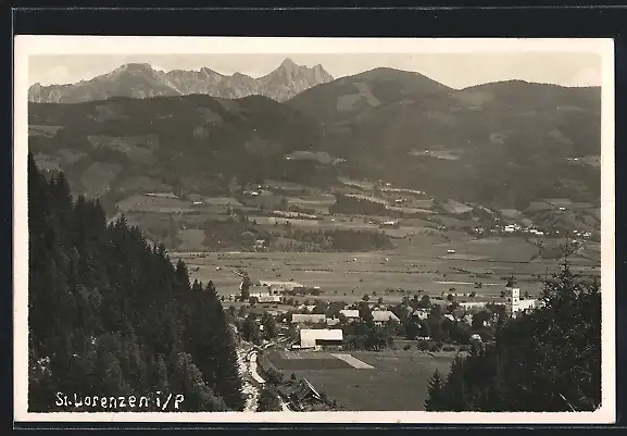 AK St. Lorenzen i. P., Totalansicht von einem Berg aus