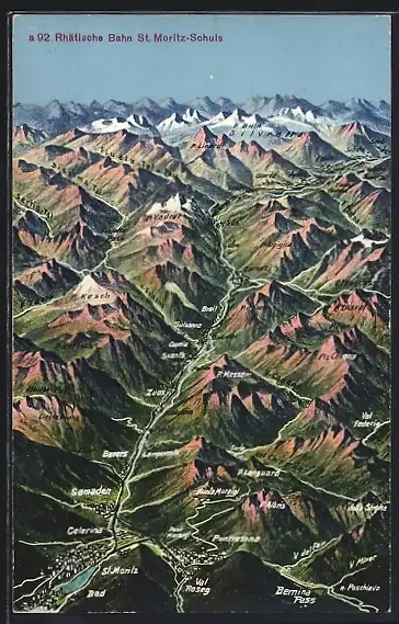 AK St. Moritz, Alpenpanorama mit der Räthischen Bahn St. Moritz-Schuls aus der Vogelschau