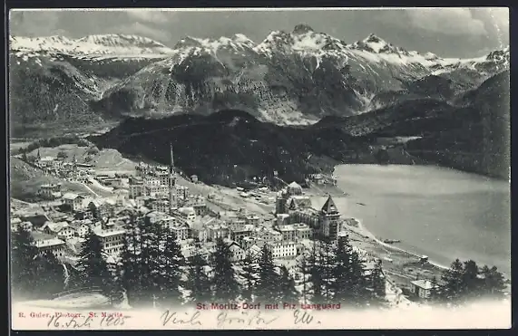 AK St. Moritz-Dorf, Totalansicht mit Piz Languard aus der Vogelschau