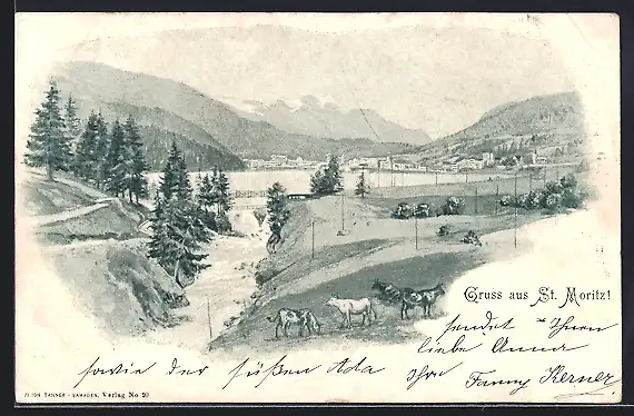 AK St. Moritz, Ortspartie mit Sturzbach und weidenden Kühen