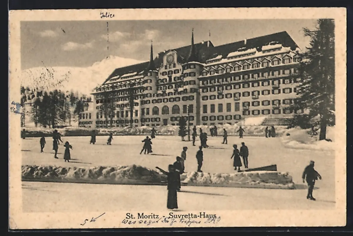 AK St. Moritz, Suvretta-Haus mit Eisläufern