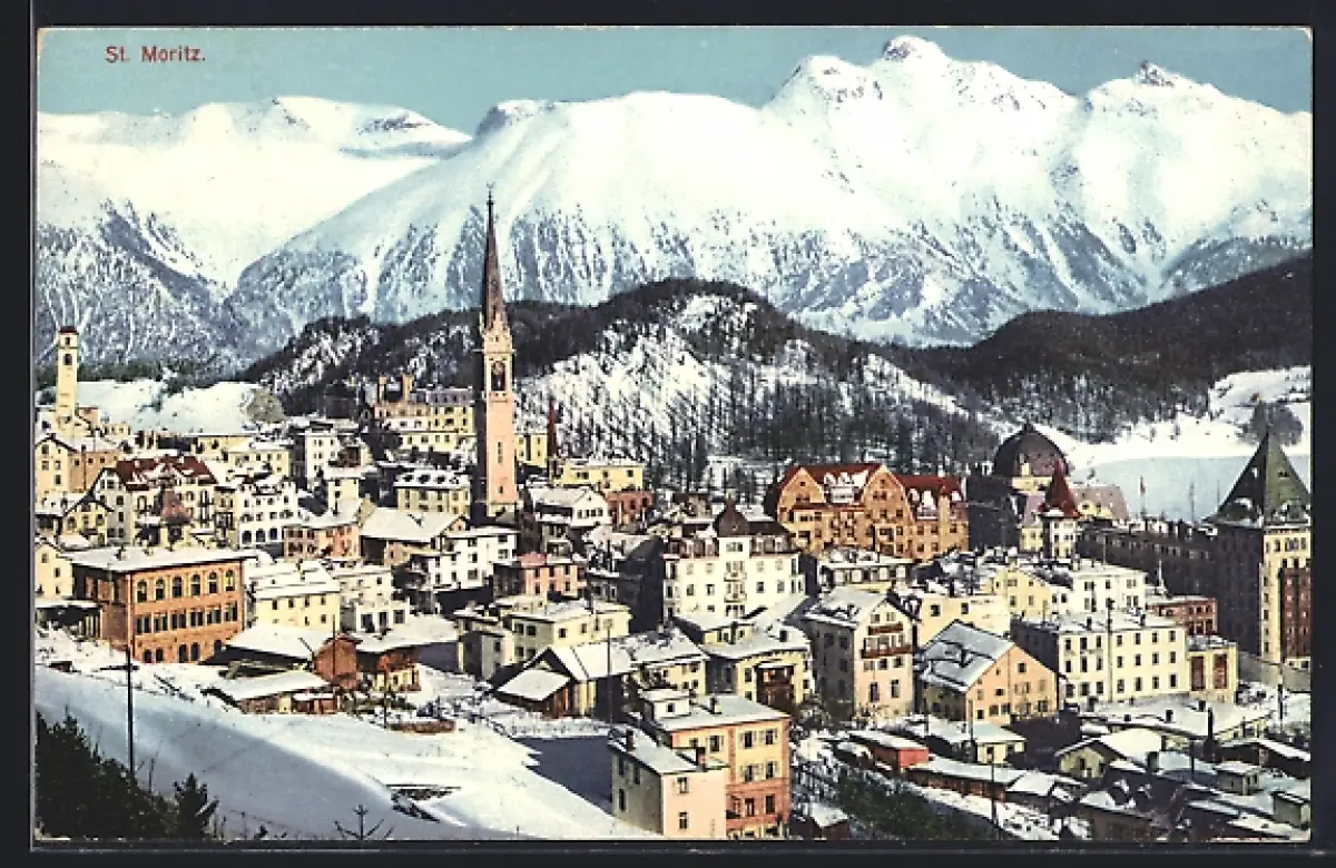 AK St. Moritz, verschneite Ortsansicht mit Kirche