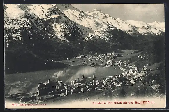 AK St. Moriz-Dorf, Ortsansicht mit Kirche und Bad aus der Vogelschau