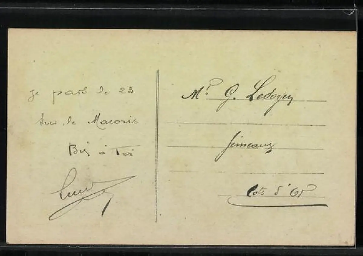 Personenbezogene Daten auf der Rückseite der Karte wurden durch blauen Textmarker unkenntlich gemacht. Die blauen Stellen sind auf die Vorderseite durchgeweicht und wirken sich negativ auf das Postkartenfoto aus