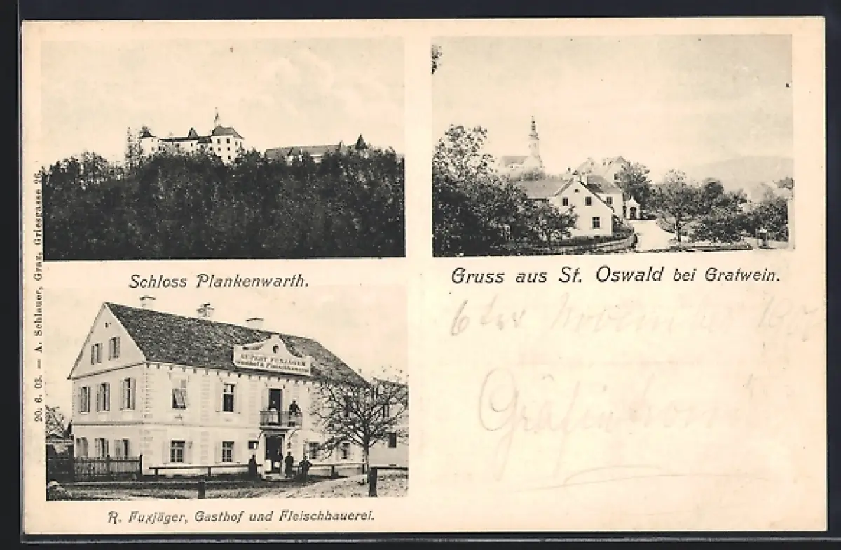 AK St. Oswald bei Plankenwarth, Schloss Plankenwarth, Gasthof und Fleischhauerei R. Fuxjäger