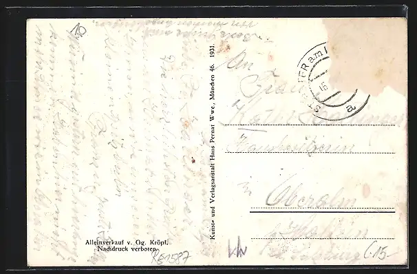 alte Ansichtskarte, gelaufen, Stempelspur, Briefmarke entfernt, rückseitig Oberflächenschaden, guter Zustand