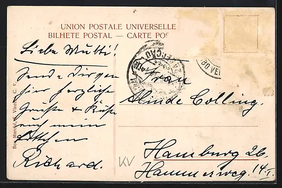 alte Ansichtskarte, gelaufen, Briefmarke entfernt, rückseitig Oberflächenschaden, guter Zustand