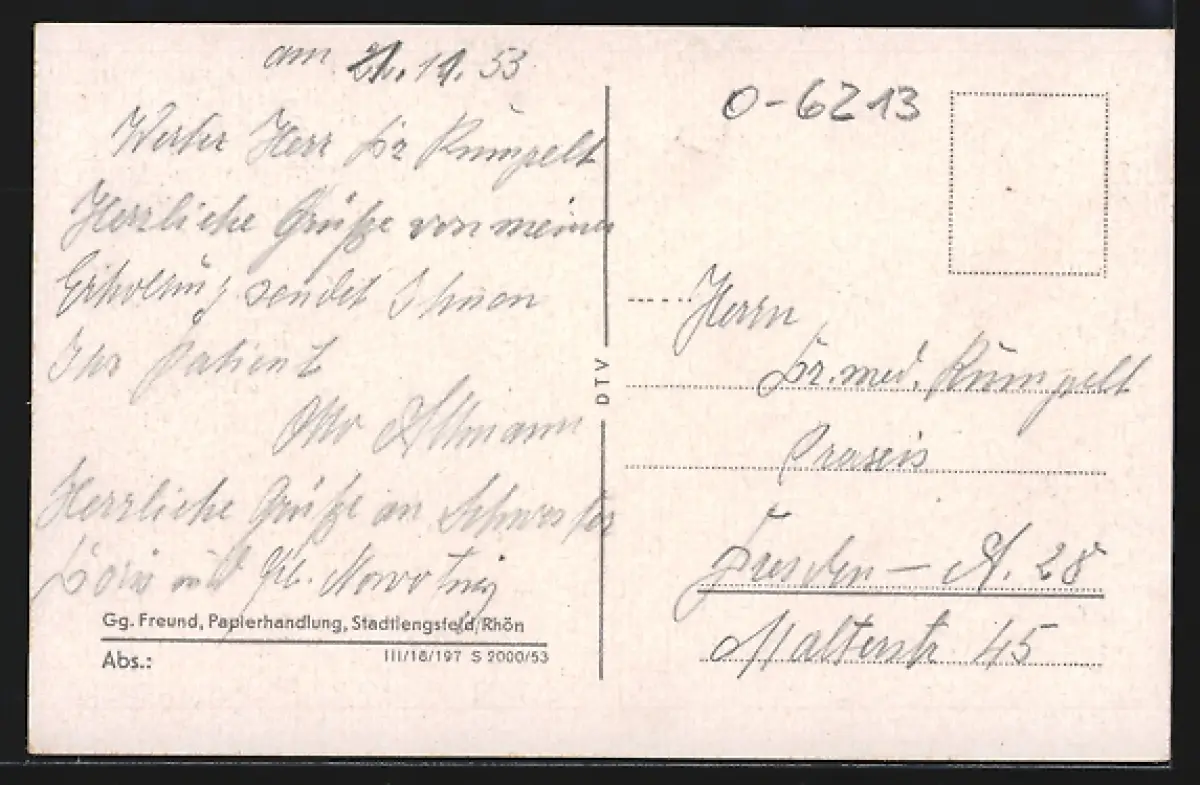 Personenbezogene Daten auf der Rückseite der Karte wurden durch blauen Textmarker unkenntlich gemacht. Die blauen Stellen sind auf die Vorderseite durchgeweicht und wirken sich negativ auf das Postkartenfoto aus