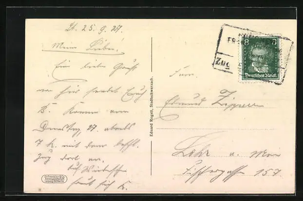 Personenbezogene Daten auf der Rückseite der Karte wurden durch blauen Textmarker unkenntlich gemacht. Die blauen Stellen sind auf die Vorderseite durchgeweicht und wirken sich negativ auf das Postkartenfoto aus