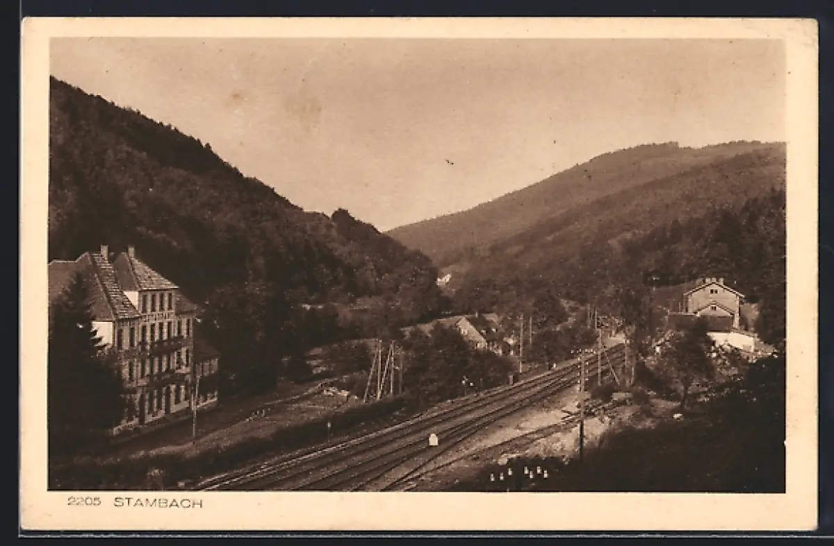 AK Stambach, Vue sur la voie ferrée et les collines boisées environnantes