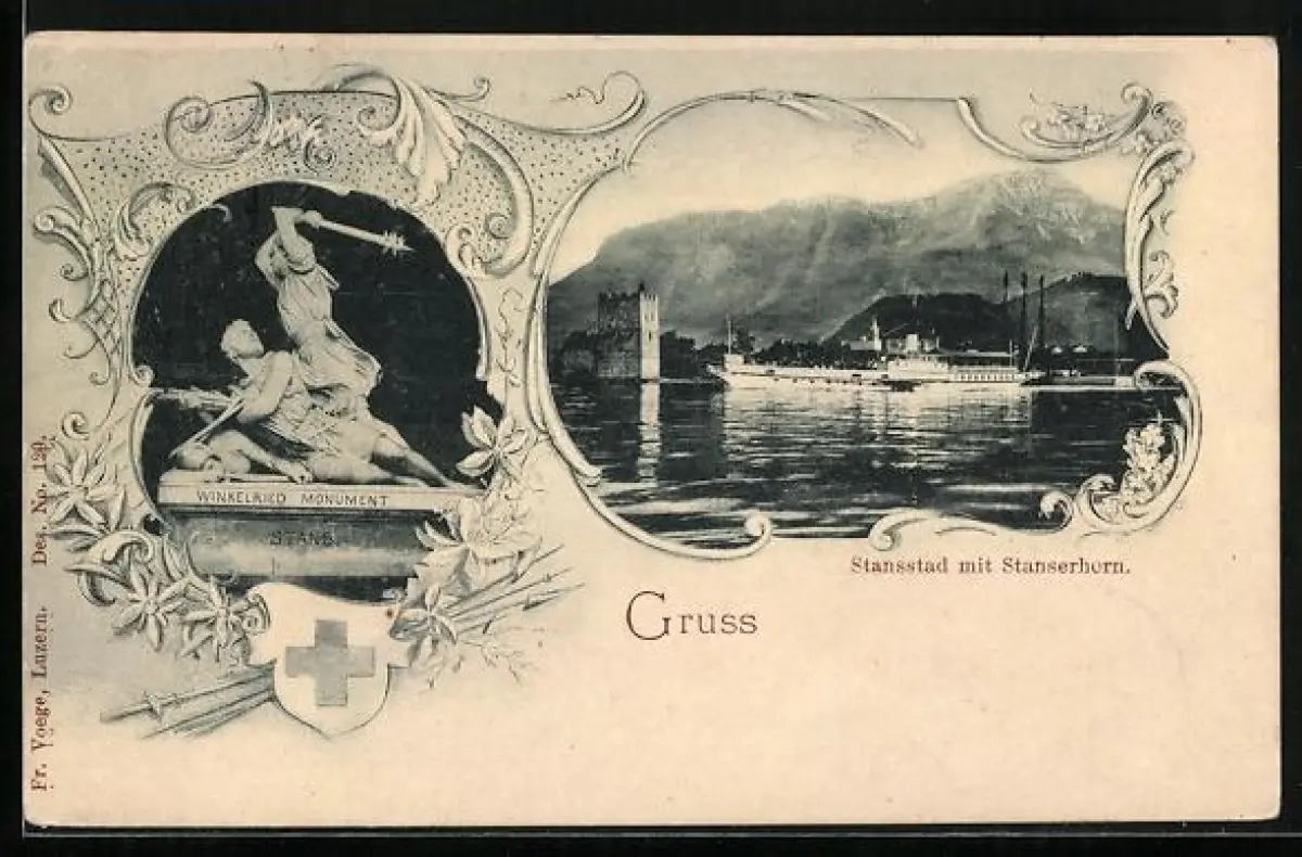 AK Stansstad, Uferpartie mit Stanserhorn, Winkelried-Monument