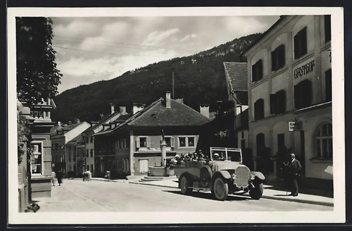 AK Steinach a. Brenner, Gasthof mit Touristenbus, Brunnen u. Strasse