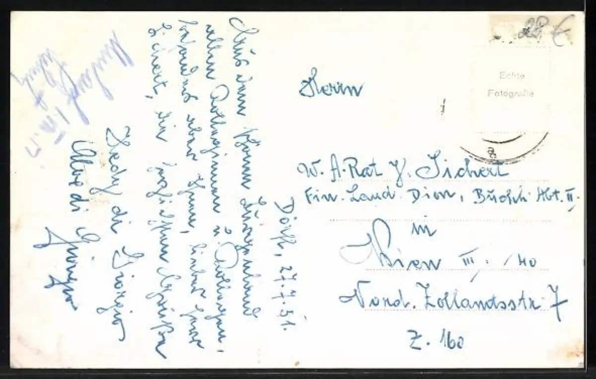gelaufen 1951, Briefmarke entfernt, rückseitig Klebe- und Papierreste, guter Zustand