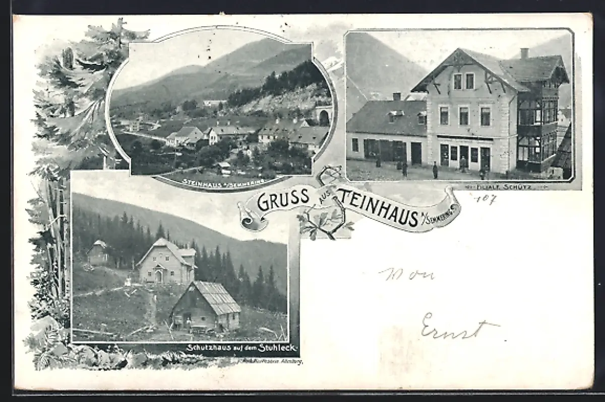 AK Steinhaus a. Semmering, Panorama, Filiale Schütz, Schutzhaus auf dem Stuhleck