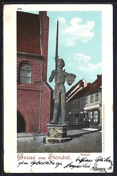 AK Stendal, Strassenpartie mit Geschäft und Roland