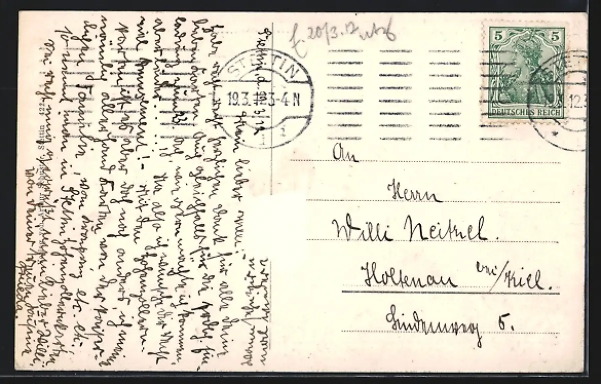 alte Ansichtskarte, gelaufen 1912, rückseitig Oberflächenschaden, Stempelspur, guter Zustand