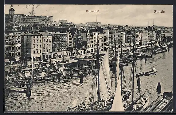 AK Stettin, Hafenbild mit Segelschiffen, Uferpanorama
