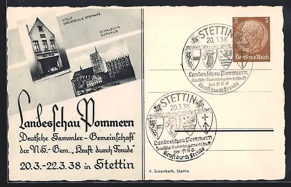 AK Stettin, Landesschau 1938, Geburtshaus Stephans in Stolp, Rathaus Stralsund, Ganzsache