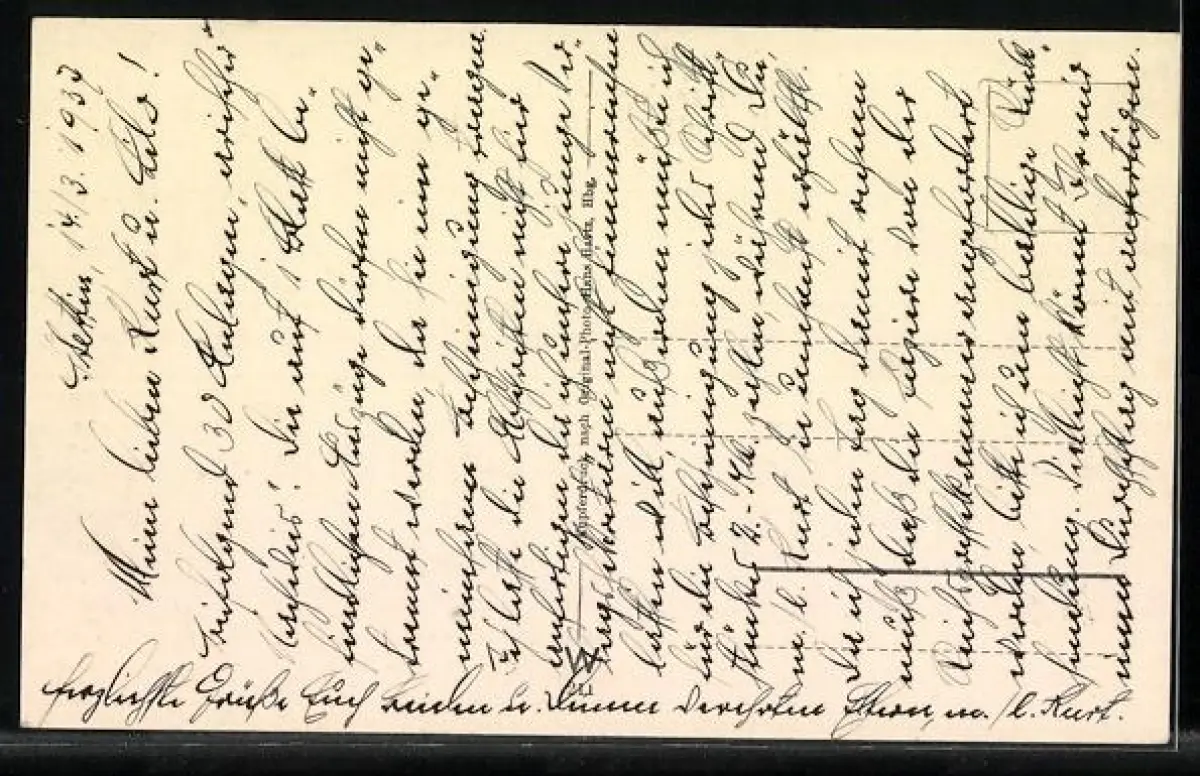 Personenbezogene Daten auf der Rückseite der Karte wurden durch blauen Textmarker unkenntlich gemacht. Die blauen Stellen sind auf die Vorderseite durchgeweicht und wirken sich negativ auf das Postkartenfoto aus