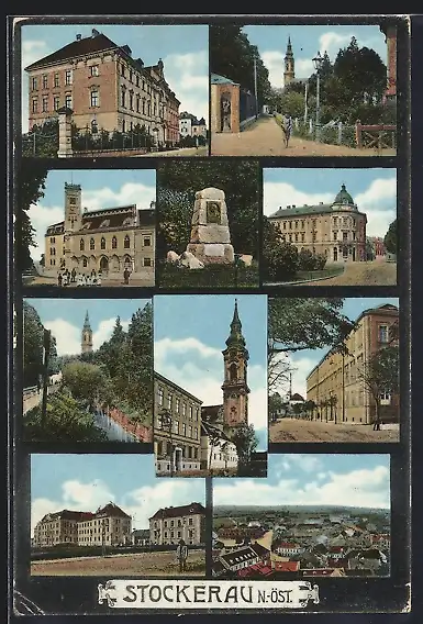 AK Stockerau, Kirche, Denkmal, Schule, Ortspartie, Strassenpartie