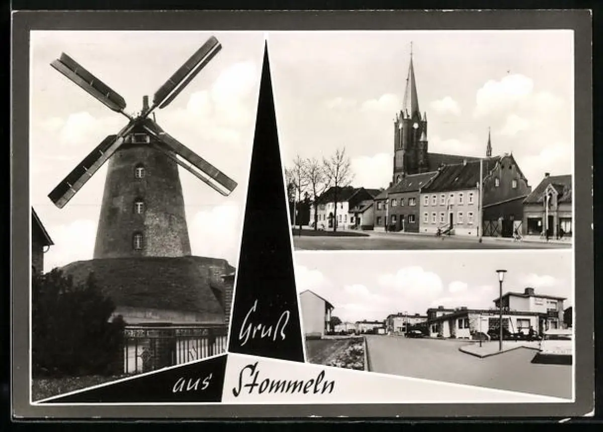 AK Stommeln, Windmühle, Kirche, Ortspartie