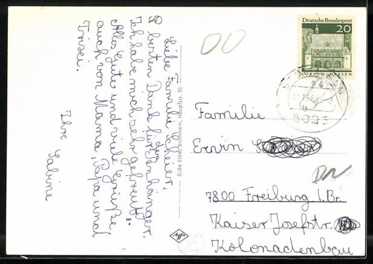 Personenbezogene Daten auf der Rückseite der Karte wurden durch blauen Textmarker unkenntlich gemacht. Die blauen Stellen sind auf die Vorderseite durchgeweicht und wirken sich negativ auf das Postkartenfoto aus