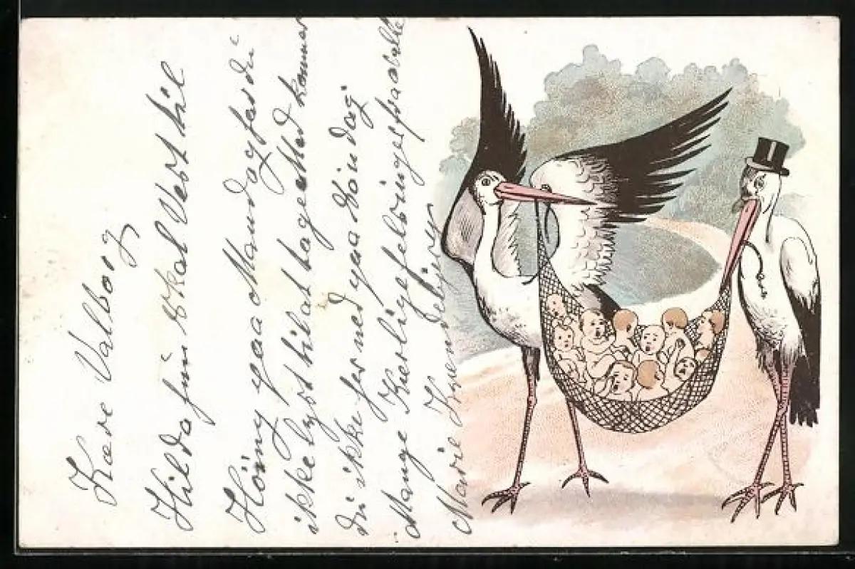 AK Storchenpaar mit Babys im Netz, vermenschlichte Tiere