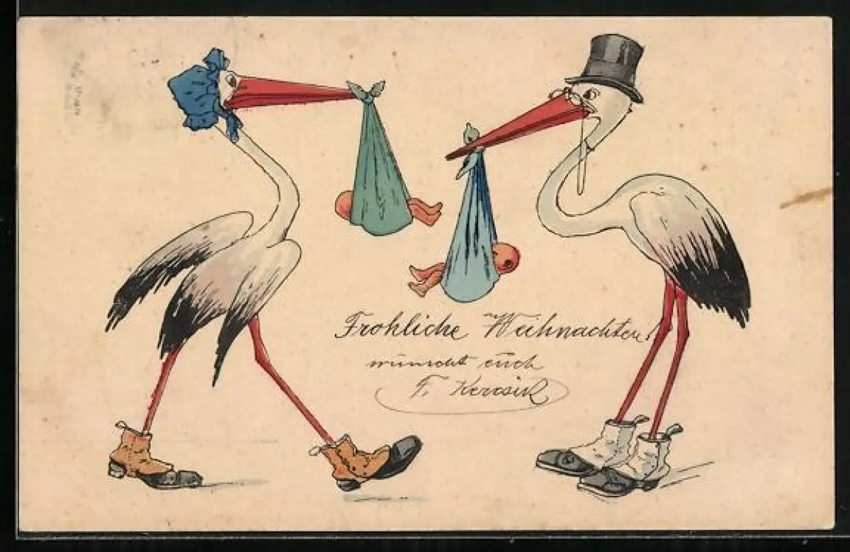 AK Storchenpaar mit zwei Babys, vermenschlichte Tiere