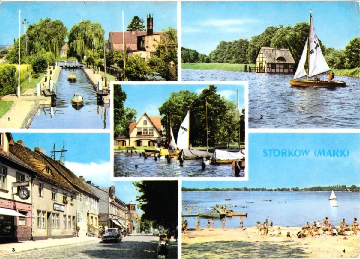 Ansichtskarte Storkow Mark fünf Abb. - Schleuse, Storkower See, Marktplatz, Strand Ferienzentrum Wolfswinkel, Sportlerheim "Wilhelm Winkler" Erhaltung I-II, Beförderungsspuren postalisch gelaufen, gestempelt: Storow, 5.7.... Druckvermerk: 1970 Herstellungsland: DDR Verlag: VEB Bild und Heimat, Reichenbach i. V. - 6231