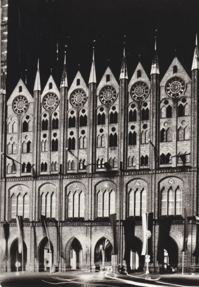 Ansichtskarte Stralsund Rathaus, Nachtansicht Erhaltung I ungelaufen Druckvermerk: 1981 Herstellungsland: DDR Verlag: Bild und Heimat, Reichenbach i. V. - 01 01 32 264