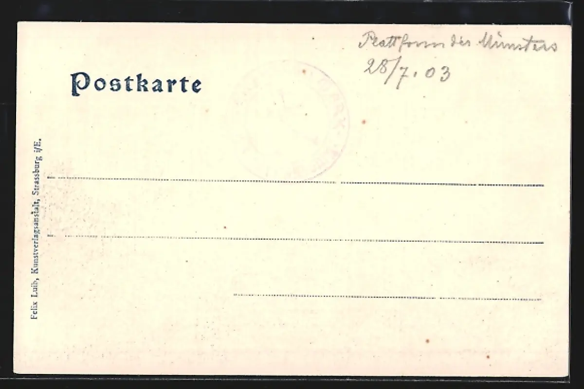 Personenbezogene Daten auf der Rückseite der Karte wurden durch blauen Textmarker unkenntlich gemacht. Die blauen Stellen sind auf die Vorderseite durchgeweicht und wirken sich negativ auf das Postkartenfoto aus