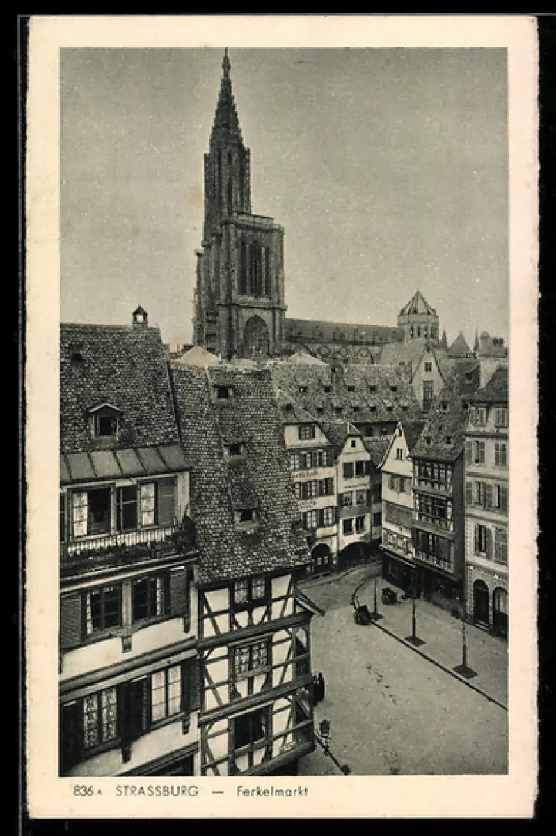 AK Strassburg, Ferkelmarkt mit Kirche