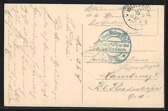 Personenbezogene Daten auf der Rückseite der Karte wurden durch blauen Textmarker unkenntlich gemacht. Die blauen Stellen sind auf die Vorderseite durchgeweicht und wirken sich negativ auf das Postkartenfoto aus