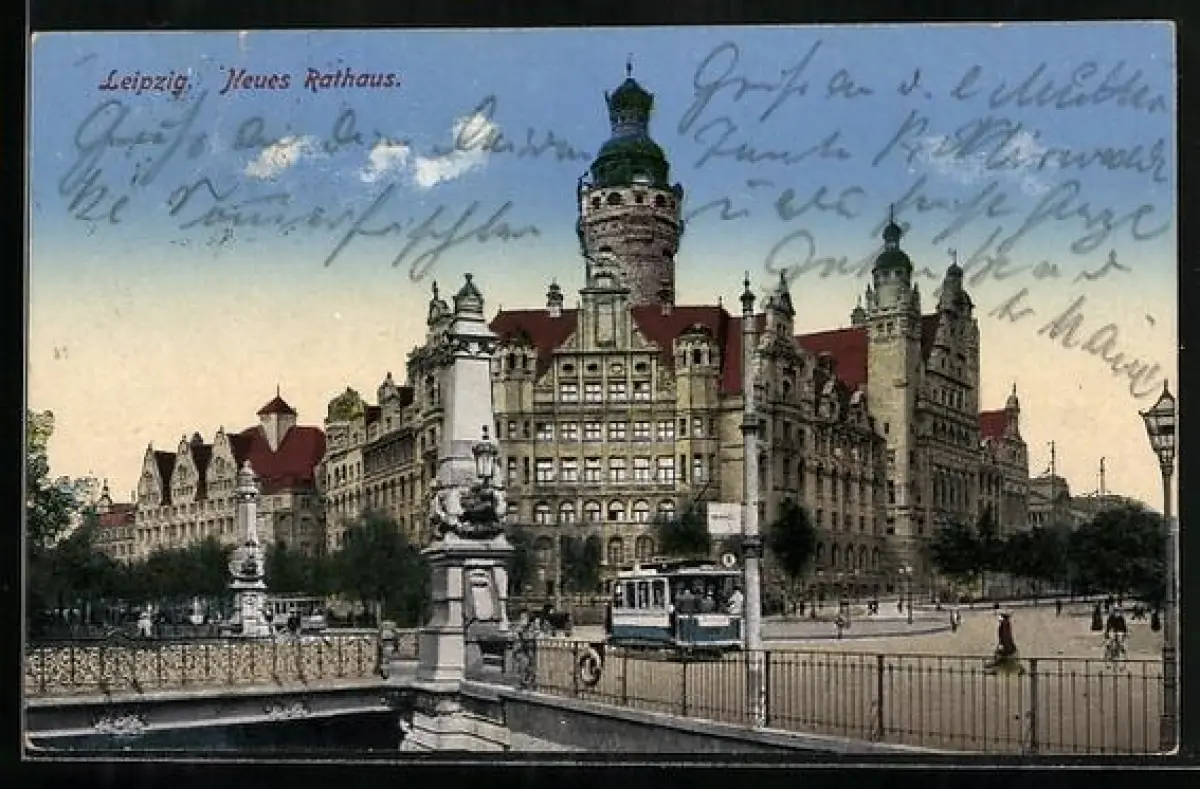 AK Strassenbahn vor dem Neuen Rathaus von Leipzig