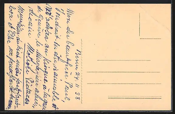 Personenbezogene Daten auf der Rückseite der Karte wurden durch blauen Textmarker unkenntlich gemacht. Die blauen Stellen sind auf die Vorderseite durchgeweicht und wirken sich negativ auf das Postkartenfoto aus
