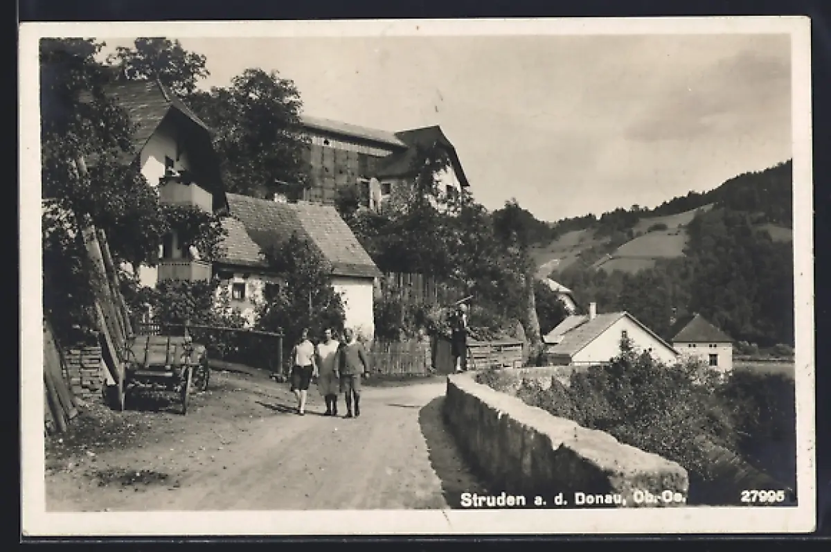 AK Struden a. d. Donau, Strassenpartie mit Mauer u. Spaziergängern