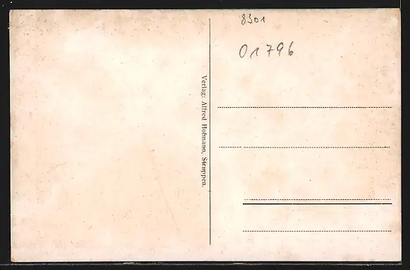 Personenbezogene Daten auf der Rückseite der Karte wurden durch blauen Textmarker unkenntlich gemacht. Die blauen Stellen sind auf die Vorderseite durchgeweicht und wirken sich negativ auf das Postkartenfoto aus