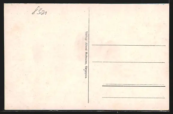 Personenbezogene Daten auf der Rückseite der Karte wurden durch blauen Textmarker unkenntlich gemacht. Die blauen Stellen sind auf die Vorderseite durchgeweicht und wirken sich negativ auf das Postkartenfoto aus