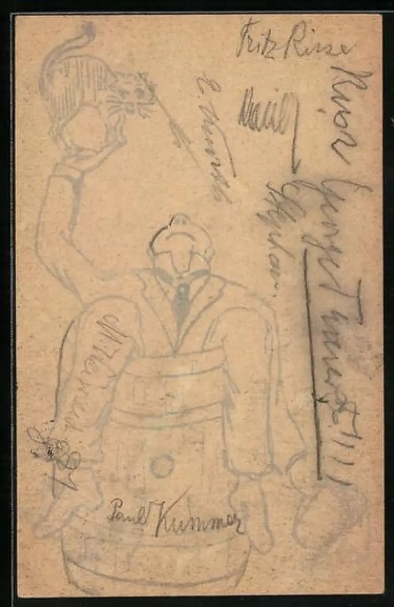 AK Student mit Bierkrug in einer Tonne und Katze auf der Hand, studentische Szene