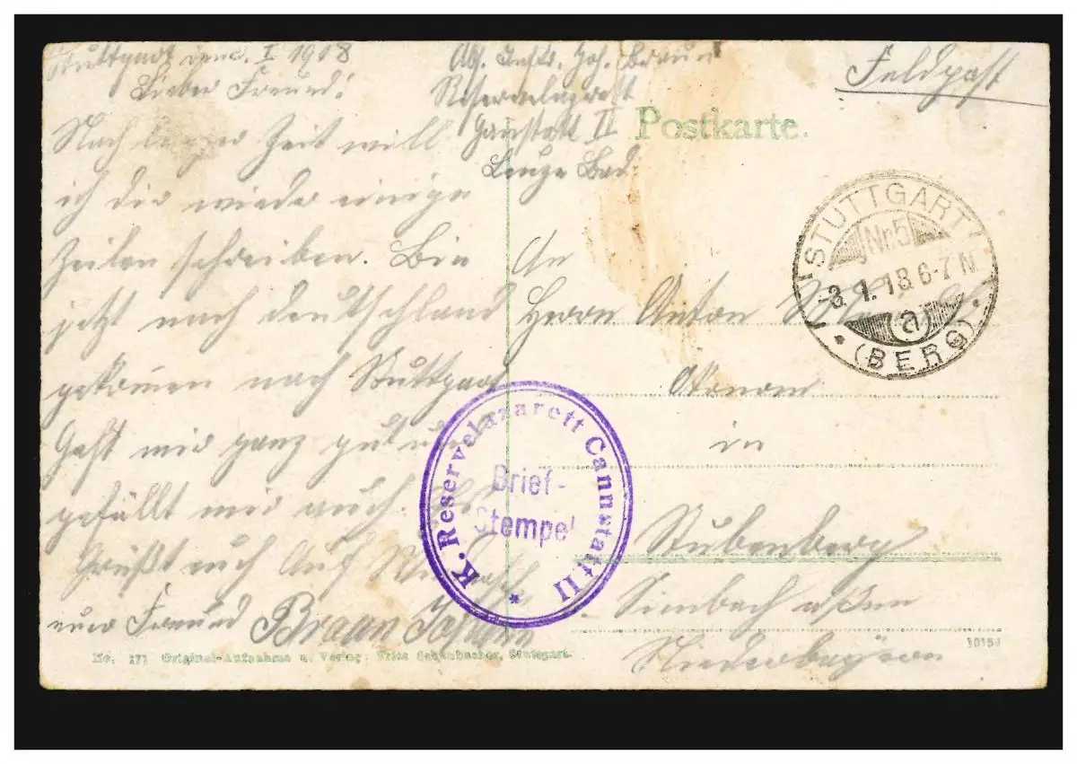 AK Stuttgart: Feldpost Reservelazarett Cannstatt II STUTTGART (BERG) 1918, Riss