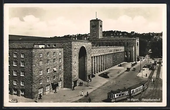 AK Stuttgart, Hauptbahnhof mit Strassenbahn davor