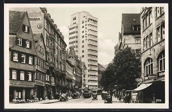 AK Stuttgart, Tagblatt, Turmhaus, Strassenbahn, Automobile, Geschäfte