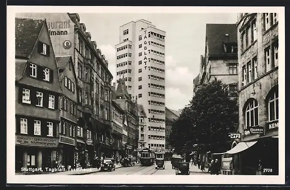 AK Stuttgart, Tagblatt, Turmhaus, Strassenbahn, Automobile, Geschäfte