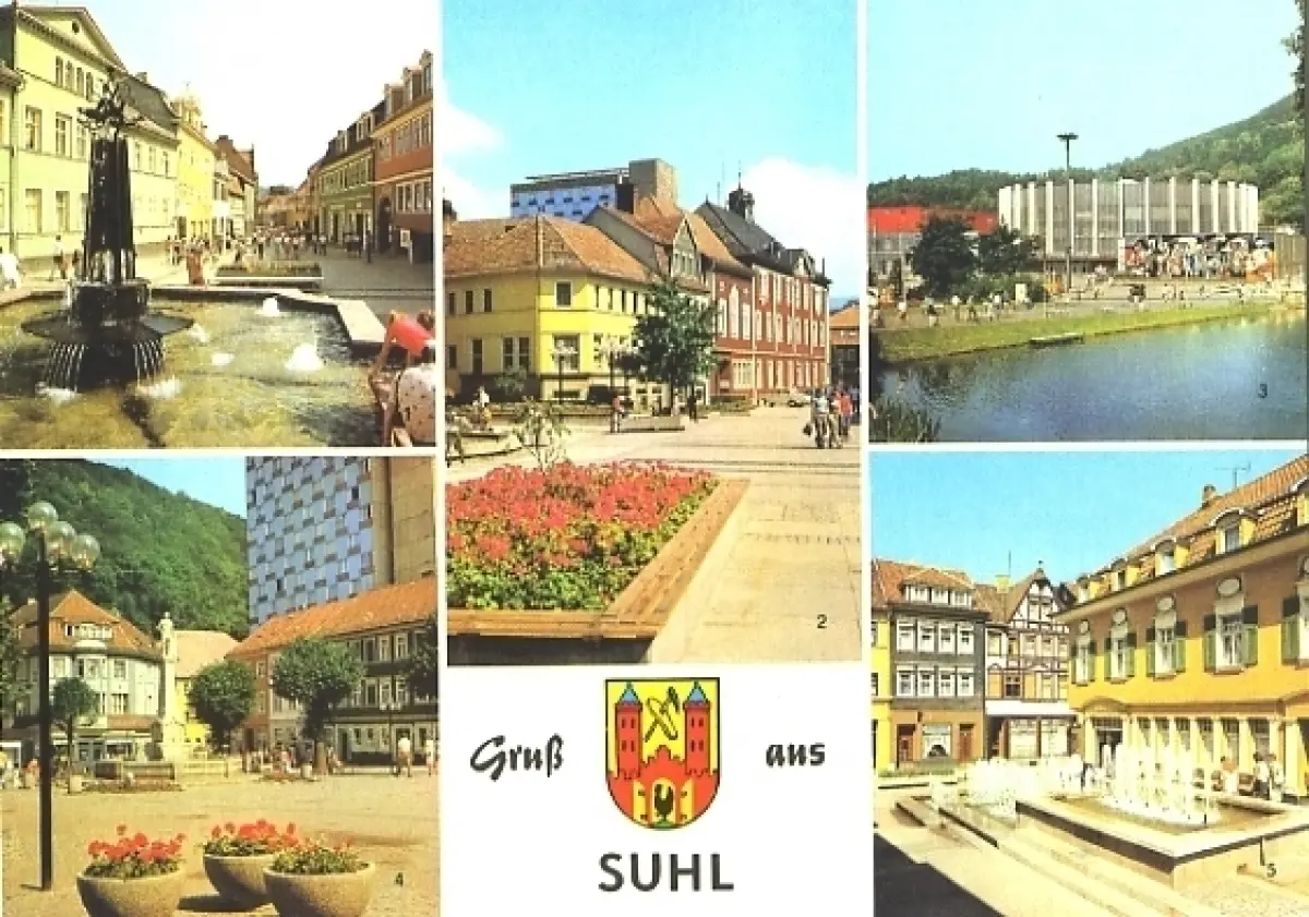 Ansichtskarte Suhl 5 Abb., Steinweg, Blick zum Rathaus, Stadthalle der Freundschaft, Karl-Marx-Platz, Springbrunnen am Steinweg Erhaltung I-II postalisch gelaufen, gestempelt: Themar, 22.5.80 Druckvermerk: 1979 Herstellungsland: DDR Verlag: Auslese-Bild-Verlag, Bad Salzungen - 09 11 1823