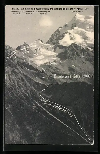AK Sulden, Skizze zur Lawinenkatastrophe im Ortlergebiet 1914