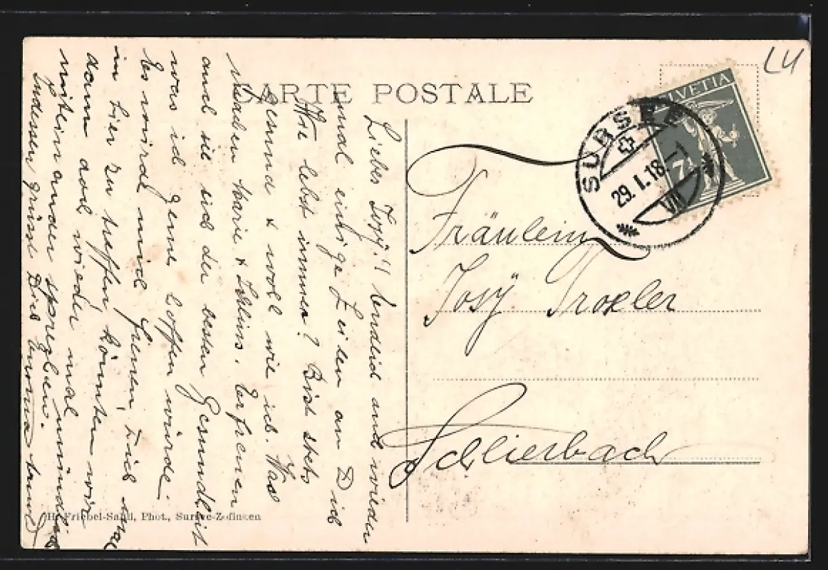 Personenbezogene Daten auf der Rückseite der Karte wurden durch blauen Textmarker unkenntlich gemacht. Die blauen Stellen sind auf die Vorderseite durchgeweicht und wirken sich negativ auf das Postkartenfoto aus