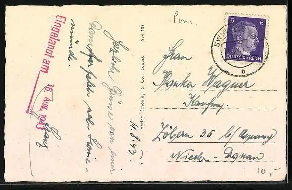 gelaufen 1943, vorderseitig Klebe- und Papierreste, guter Zustand