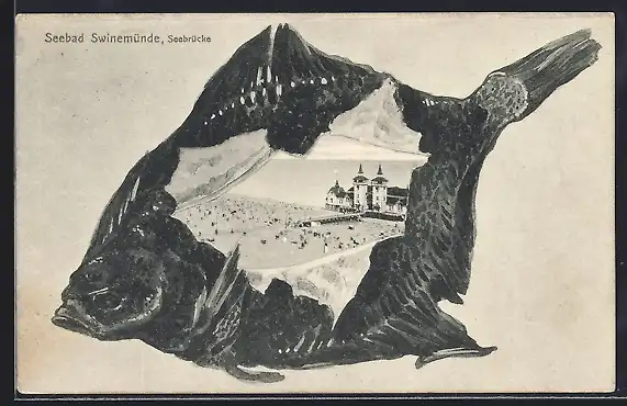 AK Swinemünde, Seebrücke im Passepartout (Flunder)